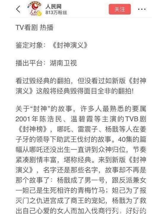 《北京日报》发文表示剧组这样的做法是“强行加料”。 偶像剧在那时确实吃香,但是不能把所有的题材全部都改编为偶像剧。 而丧失了《封神演义》本身所具有的特点。 最终该剧也是没有逃过下架的命运。 人民网的文案中,更是直言“毁得面目全非”。