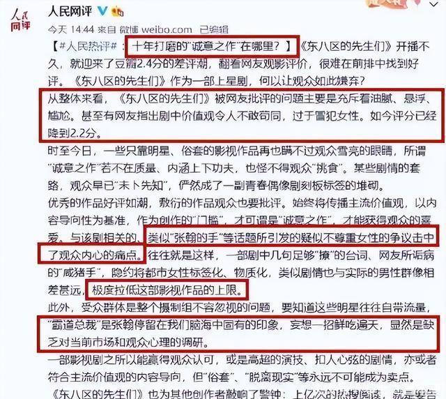 文中更是直接表示这种“俗套”的作品,已然入不了观众的眼。 人民网还表示一部好作品要么有高超的演技,要么有扣人心弦的剧情。 亦或者符合当代的主流价值观。 但显然《东八区的先生们》都没有做到。